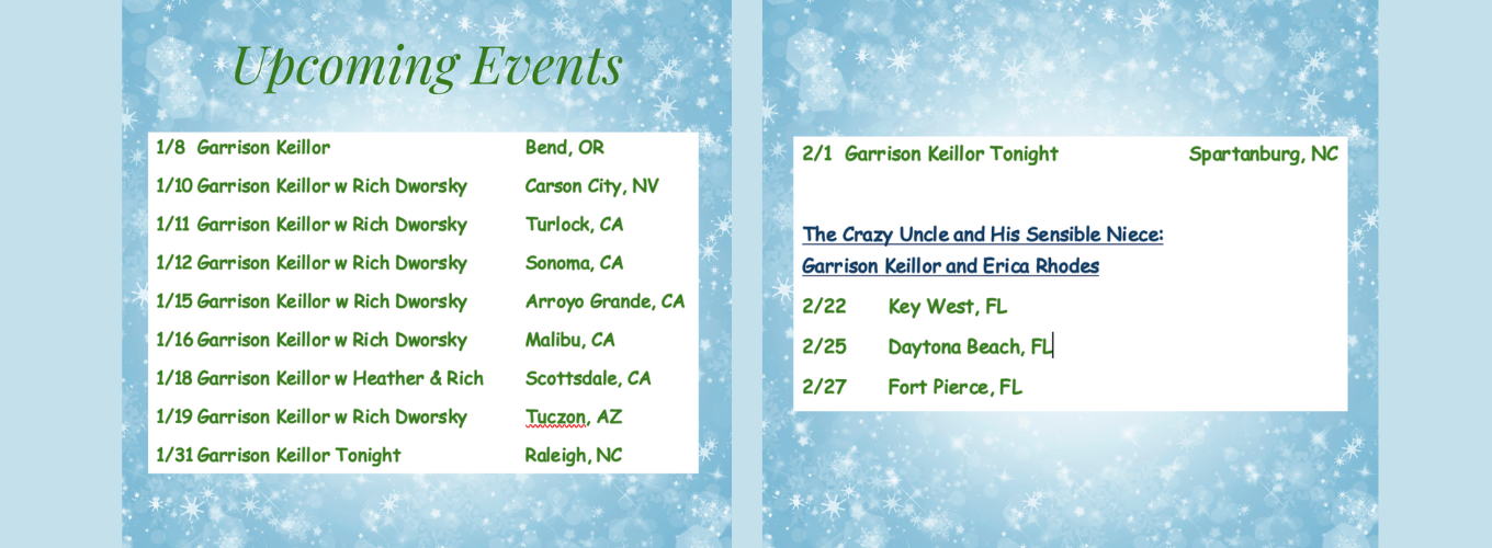 A Prairie Home Christmas A Prairie Home Companion A Prairie Home Companion Christmas An Evening of Story and Song Humor Love & Comedy Tour Old Friends Poetry Prairie Home Christmas Show Solo Songs Stories The Gratitude Tour